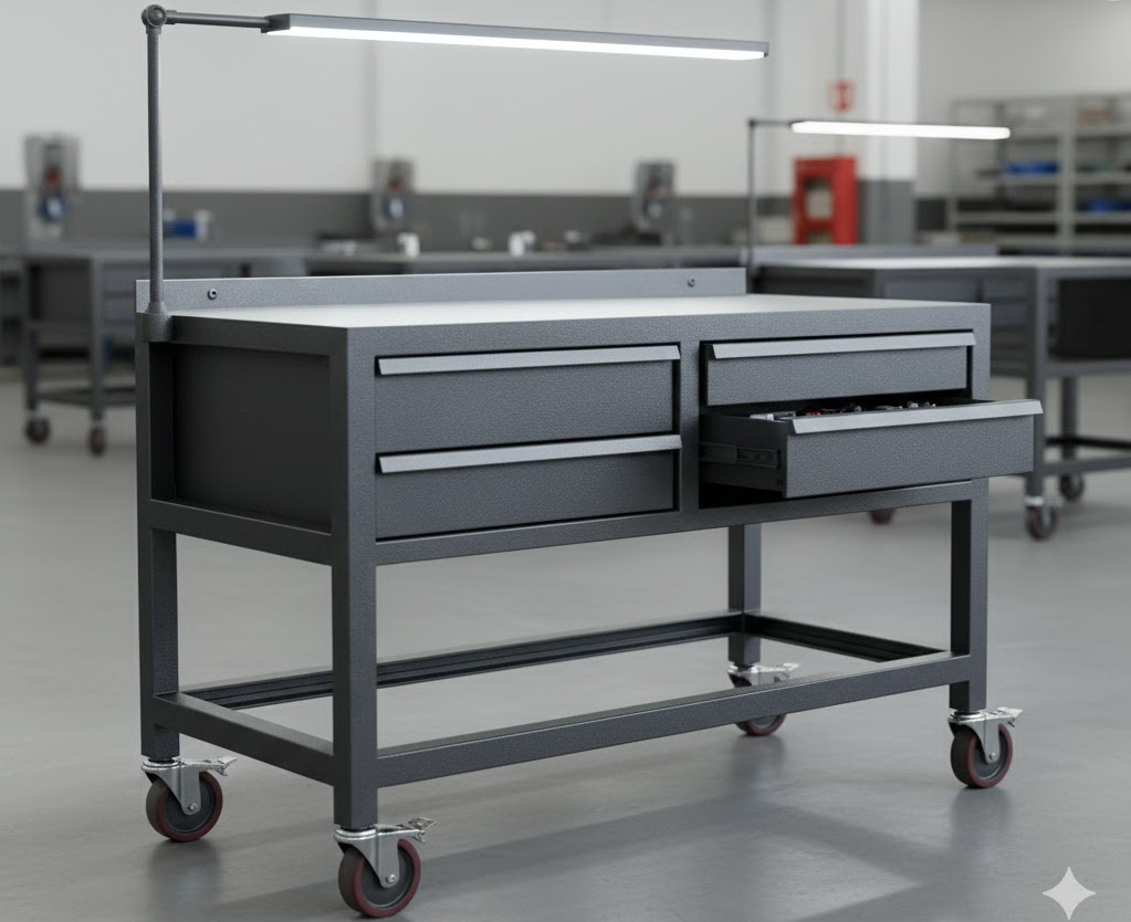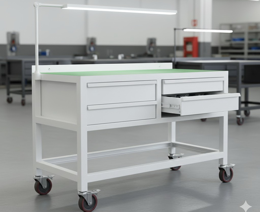 Trong ngành cơ khí, bàn thao tác được sử dụng để lắp ráp, sửa chữa và kiểm tra các chi tiết máy móc. Ánh sáng tốt và bề mặt chống tĩnh điện giúp người thợ cơ khí thực hiện các thao tác chính xác và an toàn.