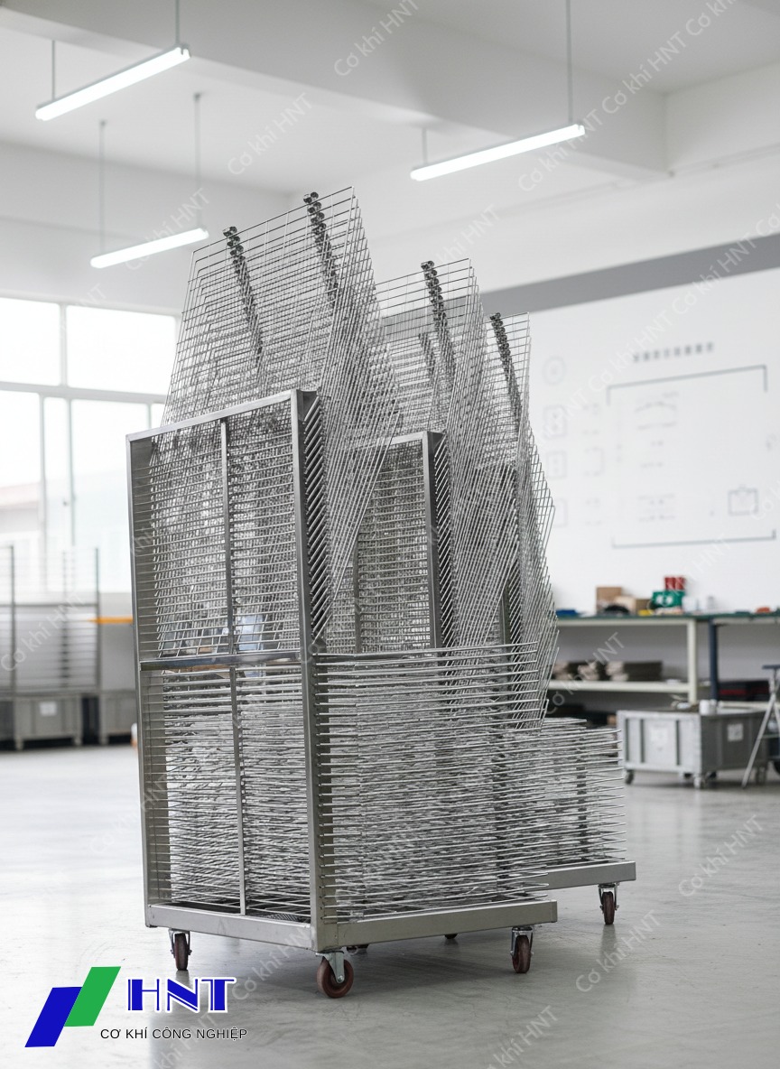 Trong lĩnh vực cơ khí, xe sấy phên lưới inox HNT nổi bật nhờ thiết kế vững chắc và khả năng chịu nhiệt cao. Sản phẩm được chế tạo từ inox 304, một loại vật liệu chống ăn mòn mạnh mẽ, giúp kéo dài tuổi thọ lên đến 10-15 năm trong môi trường khắc nghiệt. Xe sấy này thường bao gồm nhiều tầng lưới, cho phép sấy khô hàng loạt các vật liệu mà không làm mất chất lượng.